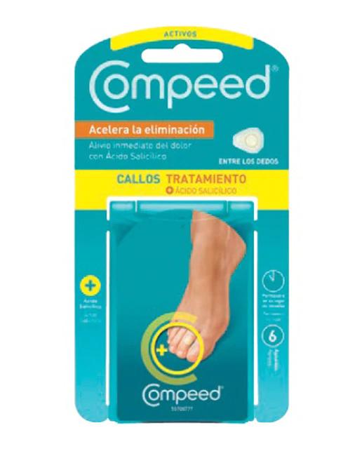 Acelera la eliminación del callo + ácido salicílico. La tecnología hidrocoloide de Compeed® consta de un gel activo que mejora la hidratación. Contiene ácido salicílico que ayuda a eliminar el callo. Compeed® actúa como una segunda piel que mantiene el equilibrio natural de humedad: protege y proporciona un efecto almohadilla frente a la fricción y la presión, alivia el dolor del callo instantáneamente, hidrata y suaviza el callo. Permanece en su lugar una media de 24 horas, pudiendo variar de unas personas a otras.